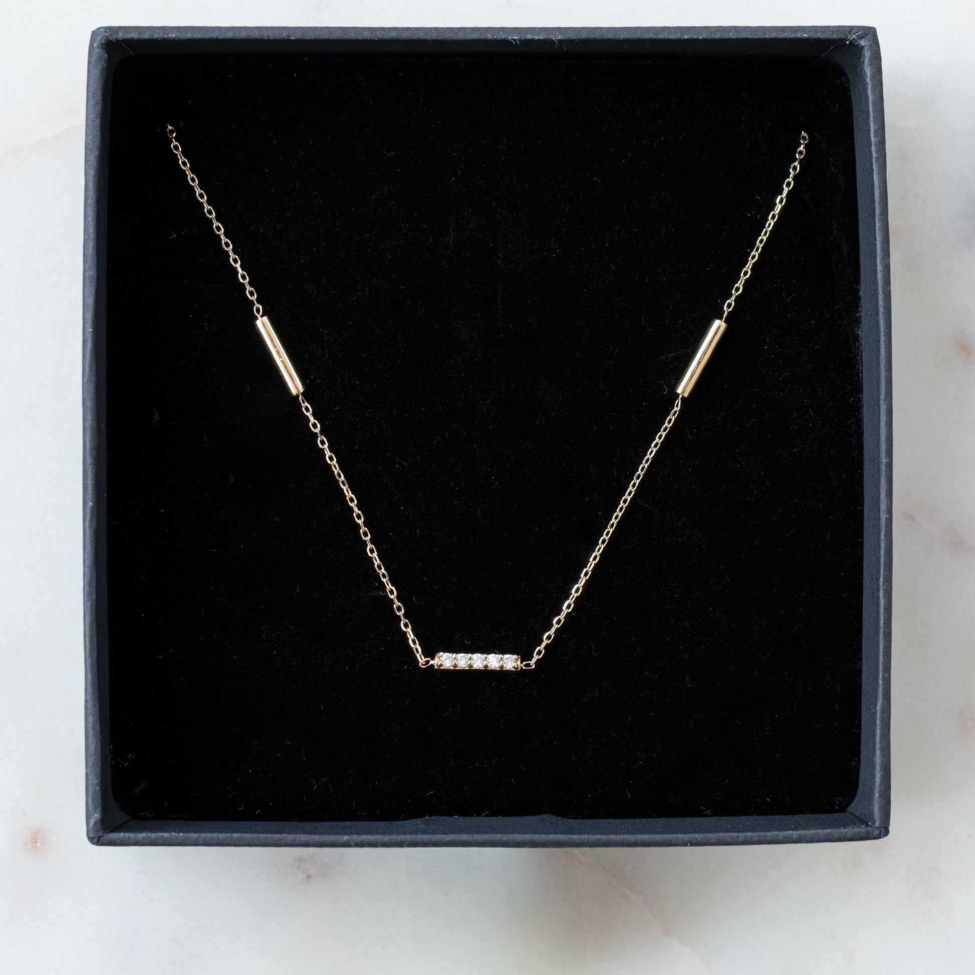 Less is more—until you add diamonds. Our take on the 14KT gold bar chain keeps things beautifully simple with its clean, polished design and just enough diamonds to give your minimalist moment a little spark.