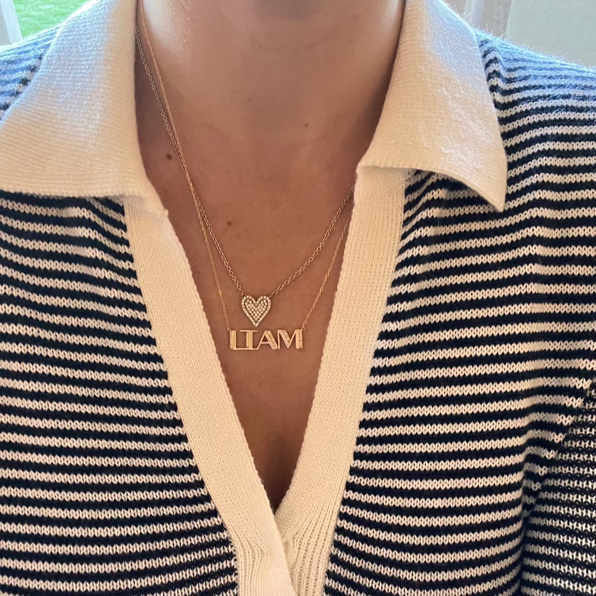Our modern elongated, pave heart pendant is eye catching with 63 prong set round diamonds. Thoughtfully designed in a two-tone finish for ultimate versatility to compliment all your jewelry pieces - 14KT Yellow or White Gold.